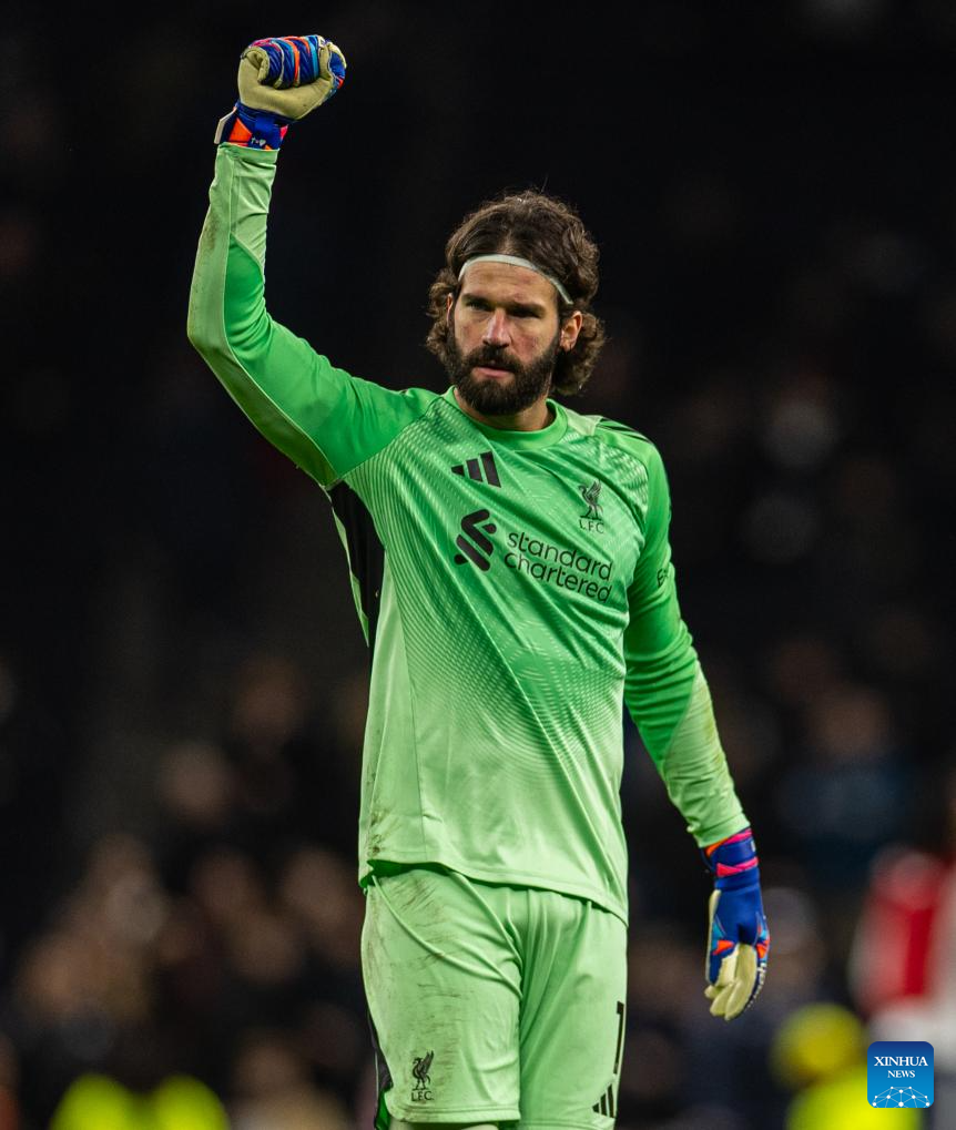 Liverpool's goalkeeper Alisson Becker celebrates after the English Premier League match between Tottenham Hotspur FC and Liverpool FC at the Tottenham Hotspur Stadium in London, Britain, on Dec. 20, 2025. (Xinhua)