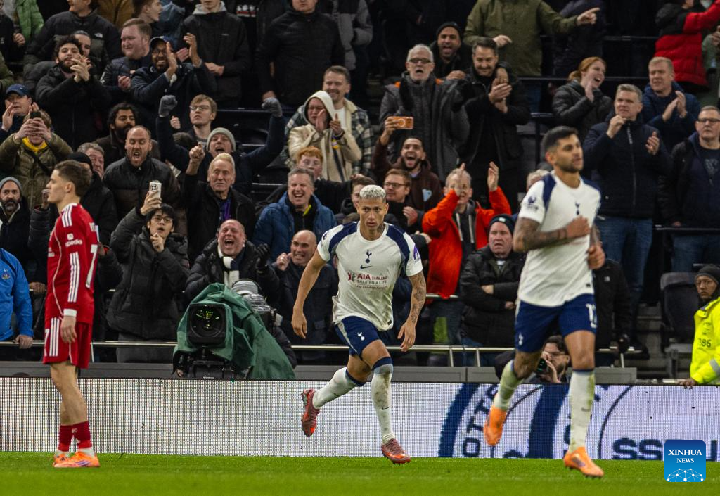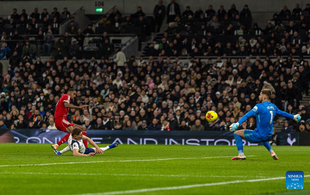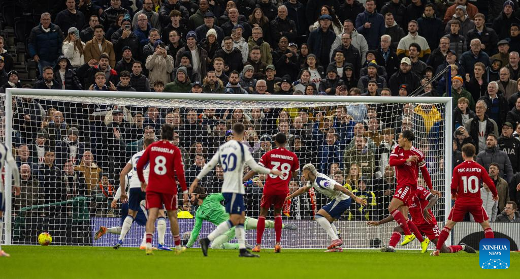 Tottenham Hotspur's Richarlison de Andrade (3rd R) scores during the English Premier League match between Tottenham Hotspur FC and Liverpool FC at the Tottenham Hotspur Stadium in London, Britain, on Dec. 20, 2025. (Xinhua)