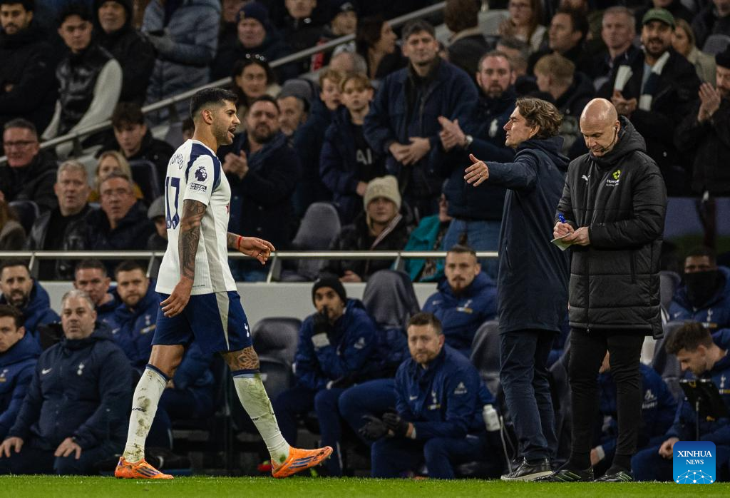 Tottenham Hotspur's captain Cristian Romero walks off after being shown a red card during the English Premier League match between Tottenham Hotspur FC and Liverpool FC at the Tottenham Hotspur Stadium in London, Britain, on Dec. 20, 2025. (Xinhua)