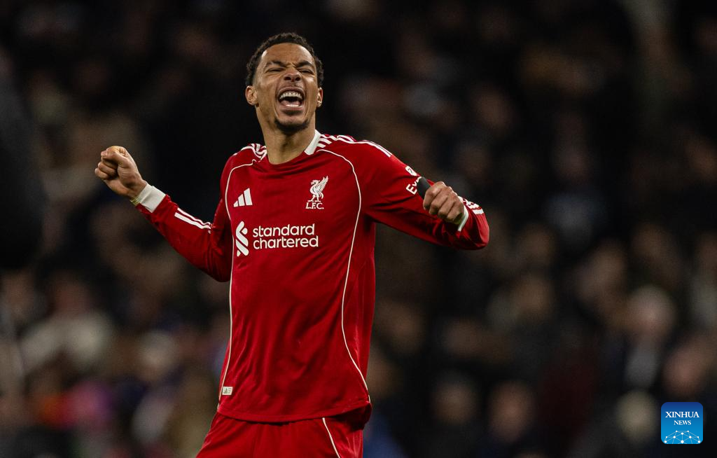 Liverpool's Hugo Ekitike celebrates after the English Premier League match between Tottenham Hotspur FC and Liverpool FC at the Tottenham Hotspur Stadium in London, Britain, on Dec. 20, 2025. (Xinhua)