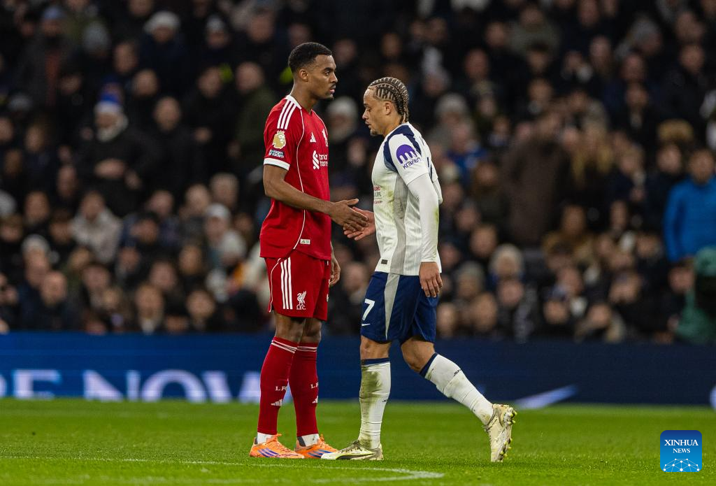 Tottenham Hotspur's Xavi Simons (R) walks past Liverpool's Ryan Gravenberch after being shown a red card and sent off during the English Premier League match between Tottenham Hotspur FC and Liverpool FC at the Tottenham Hotspur Stadium in London, Britain, on Dec. 20, 2025. (Xinhua)