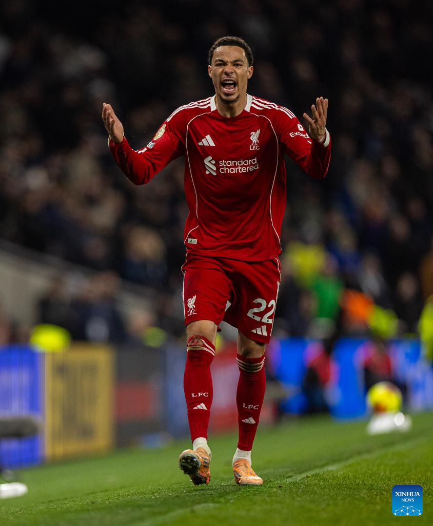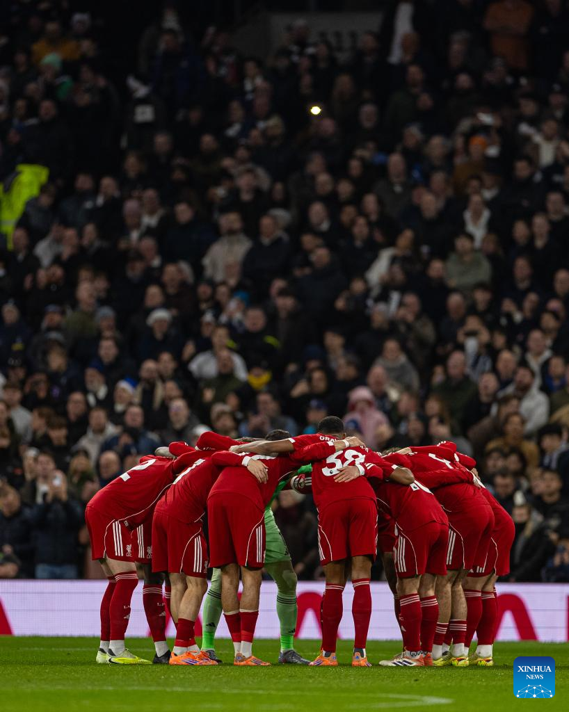 Liverpool's players cheer up before the English Premier League match between Tottenham Hotspur FC and Liverpool FC at the Tottenham Hotspur Stadium in London, Britain, on Dec. 20, 2025. (Xinhua)