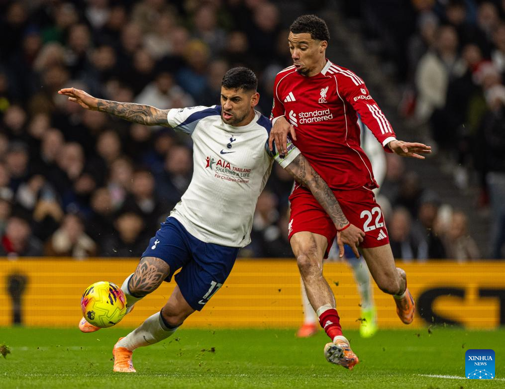Liverpool's Hugo Ekitike (R) is challenged by Tottenham Hotspur's Cristian Romero during the English Premier League match between Tottenham Hotspur FC and Liverpool FC at the Tottenham Hotspur Stadium in London, Britain, on Dec. 20, 2025. (Xinhua)