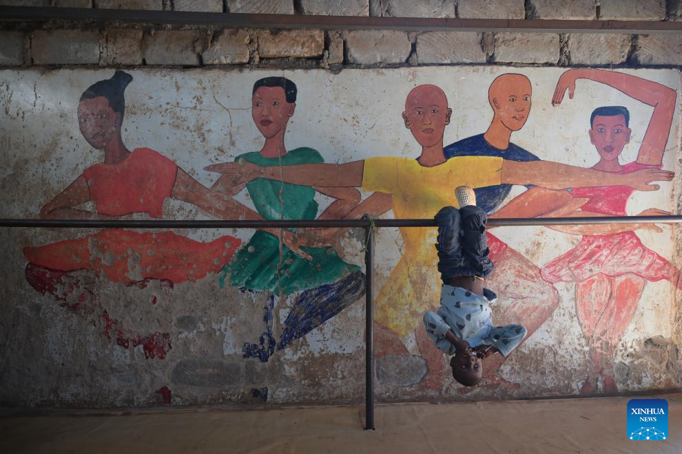A boy plays on a barre of the Kibera Ballet School at the Kibera slum in Nairobi, Kenya, Dec. 23, 2025. A Christmas ballet performance organized by the Kibera Ballet School was held here on Tuesday, attracting many local residents to watch. (Xinhua/Yang Guang)