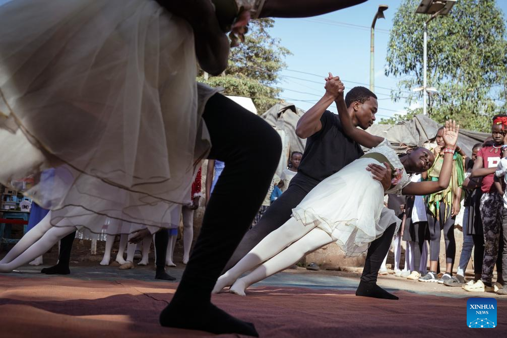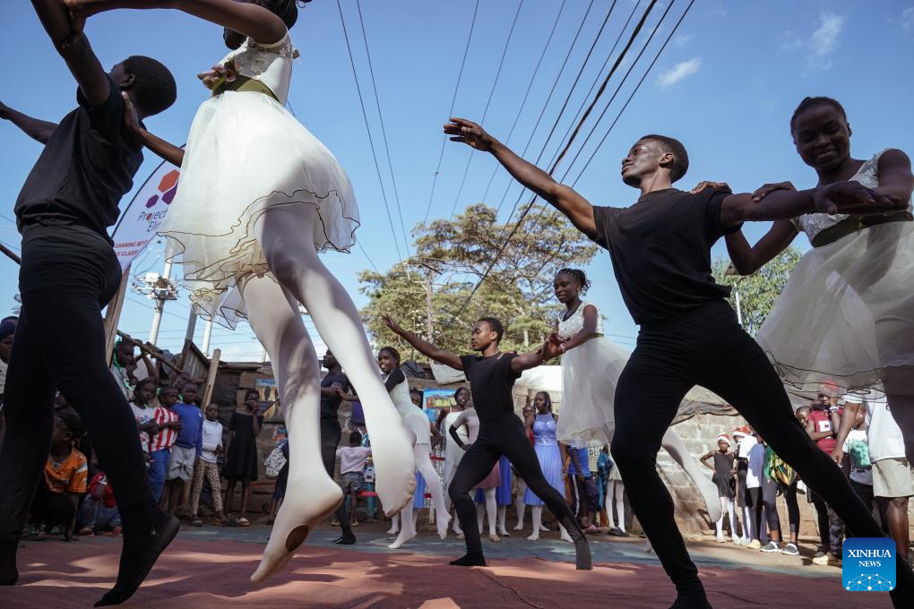 Young dancers perform on a simple stage at the Kibera slum in Nairobi, Kenya, Dec. 23, 2025. A Christmas ballet performance organized by the Kibera Ballet School was held here on Tuesday, attracting many local residents to watch. (Xinhua/Yang Guang)