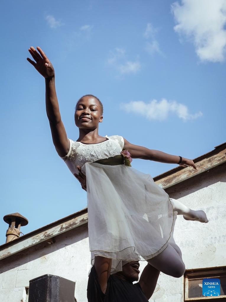 A young dancer performs on a simple stage at the Kibera slum in Nairobi, Kenya, Dec. 23, 2025. A Christmas ballet performance organized by the Kibera Ballet School was held here on Tuesday, attracting many local residents to watch. (Xinhua/Yang Guang)
