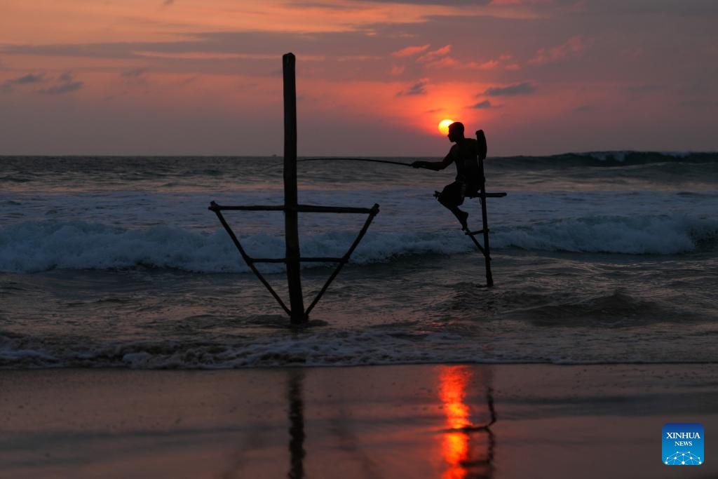 A fisherman fishes on a stilt at a beach in Koggala, Sri Lanka, Dec. 26, 2025. (Photo by Thilina Kaluthotage/Xinhua)
