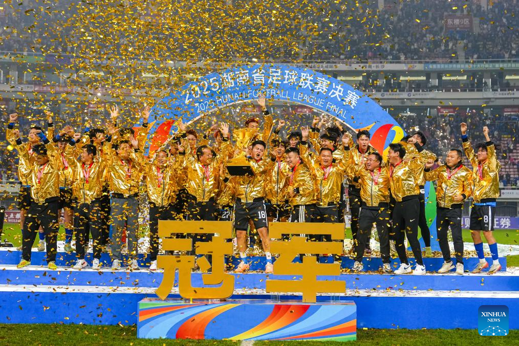 Champion Team Yongzhou celebrate victory during the awarding ceremony for the 2025 Hunan Football League in Changsha, central China's Hunan Province, Dec. 27, 2025. (Xinhua/Chen Sihan)