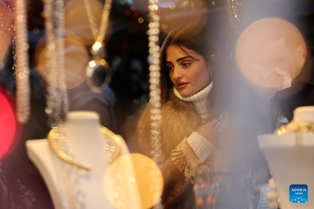 A woman walks past a jewelry stall at a Christmas market at Piazza Navona in Rome, Italy, Dec. 27, 2025. (Xinhua/Li Jing)