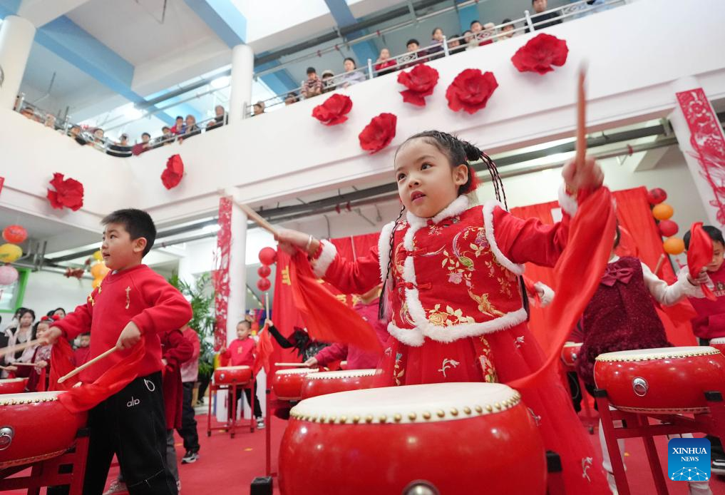 Children perform a drum dance at a kindergarten in Yinchuan, northwest China's Ningxia Hui Autonomous Region, Dec. 27, 2025.