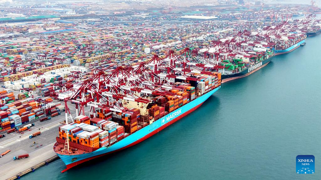 This aerial drone photo taken on Dec. 27, 2025 shows cargo ships loading and unloading containers at Qingdao Port in east China's Shandong Province.