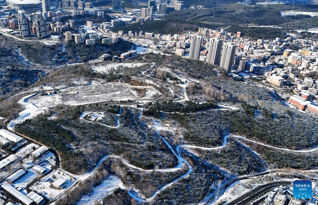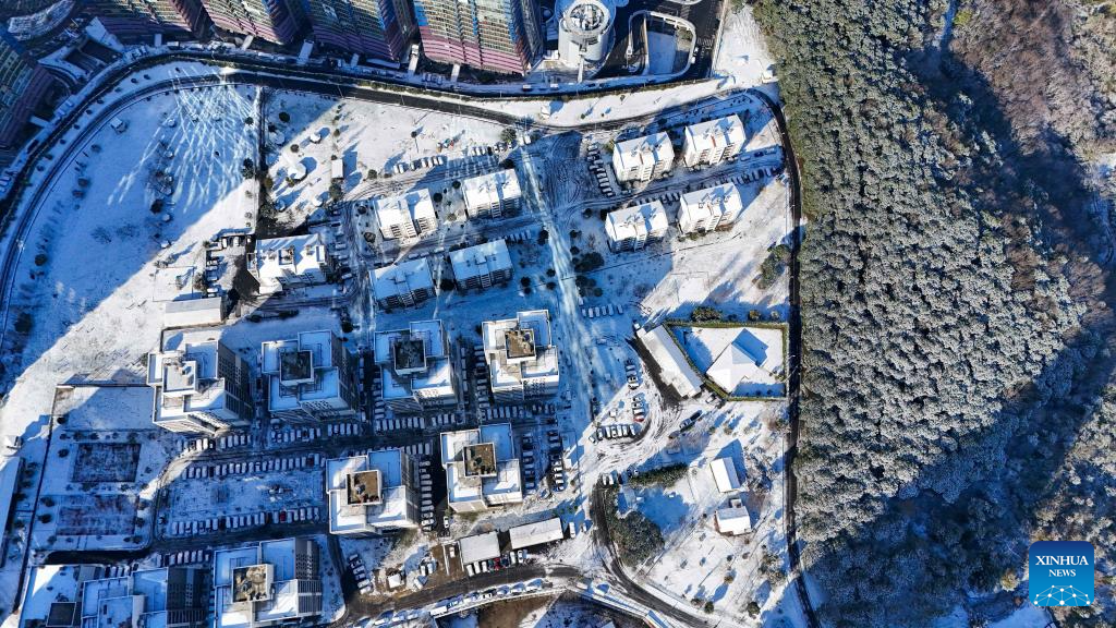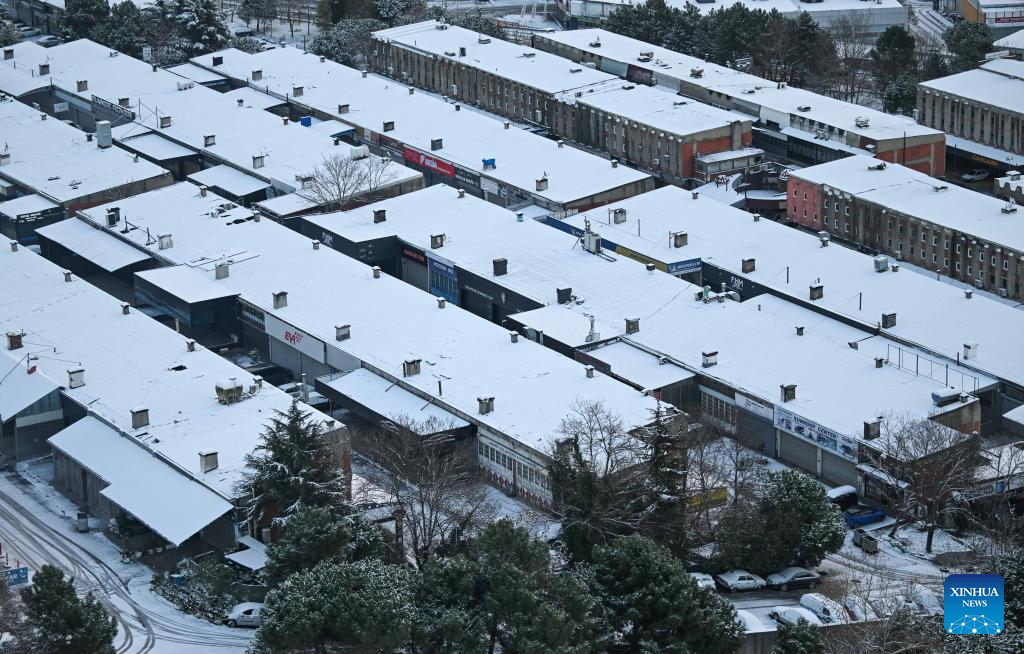 An aerial drone photo taken on Jan. 1, 2026 shows the view after a snowfall in Istanbul, Türkiye. (Xinhua/Liu Lei)