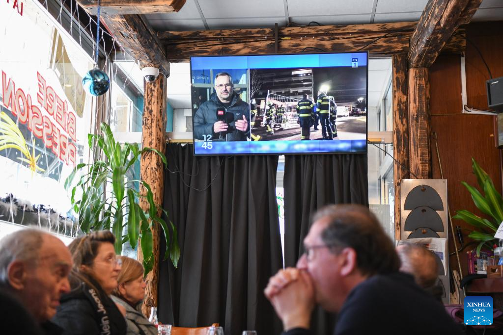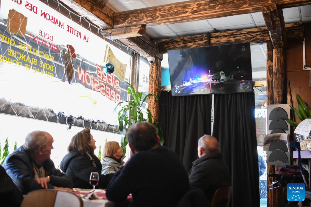 People watch the news of an explosion and a fire at a bar on television in Geneva, Switzerland, Jan. 1, 2026. Several dozen people are feared dead and around 100 injured Thursday after an explosion and a fire at a bar in the Crans-Montana ski resort in Valais Canton of southwestern Switzerland, local police said. (Xinhua/Lian Yi)