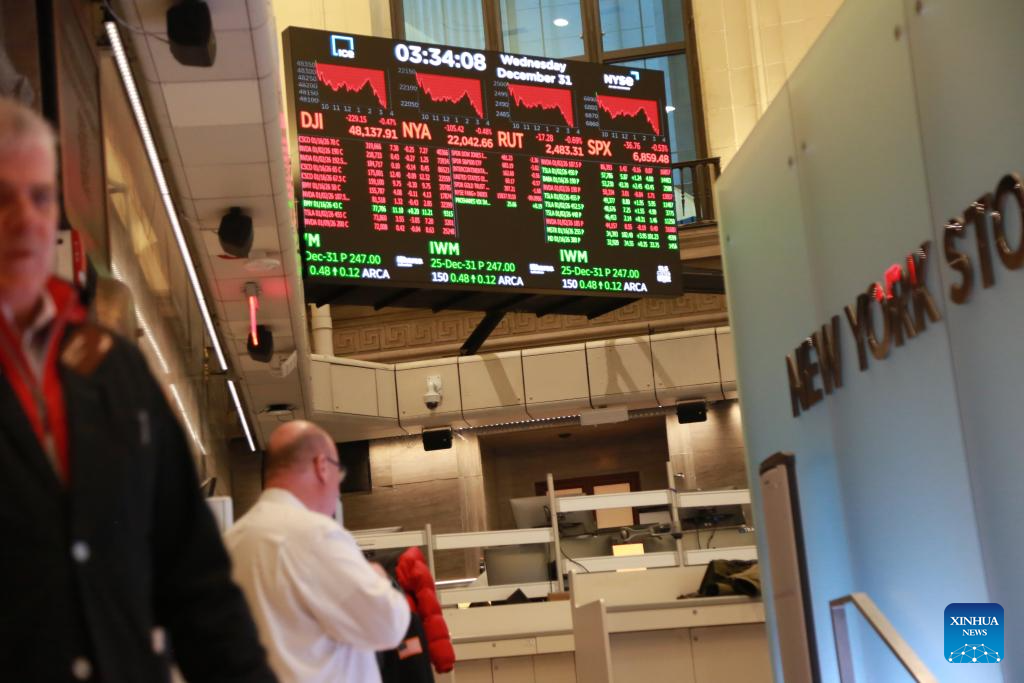 An electronic screen displaying stock information is pictured at the New York Stock Exchange in New York, the United States, Dec. 31, 2025. U.S. stocks ended lower on Wednesday. The Dow Jones Industrial Average fell by 303.77 points, or 0.63 percent, to 48,063.29. The S&P 500 sank 50.74 points, or 0.74 percent, to 6,845.5. The Nasdaq Composite Index shed 177.089 points, or 0.76 percent, to 23,241.991. (Xinhua/Liu Yanan)