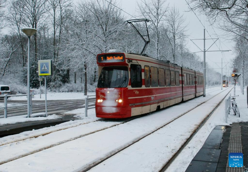 A tram runs on snow-covered tracks in the Hague, the Netherlands, Jan. 7, 2026. The Royal Netherlands Meteorological Institute (KNMI) issued a code orange snowfall warning on Wednesday, with some areas of the Netherlands receiving up to 10 centimeters of snow. (Xinhua/Shao Haijun)