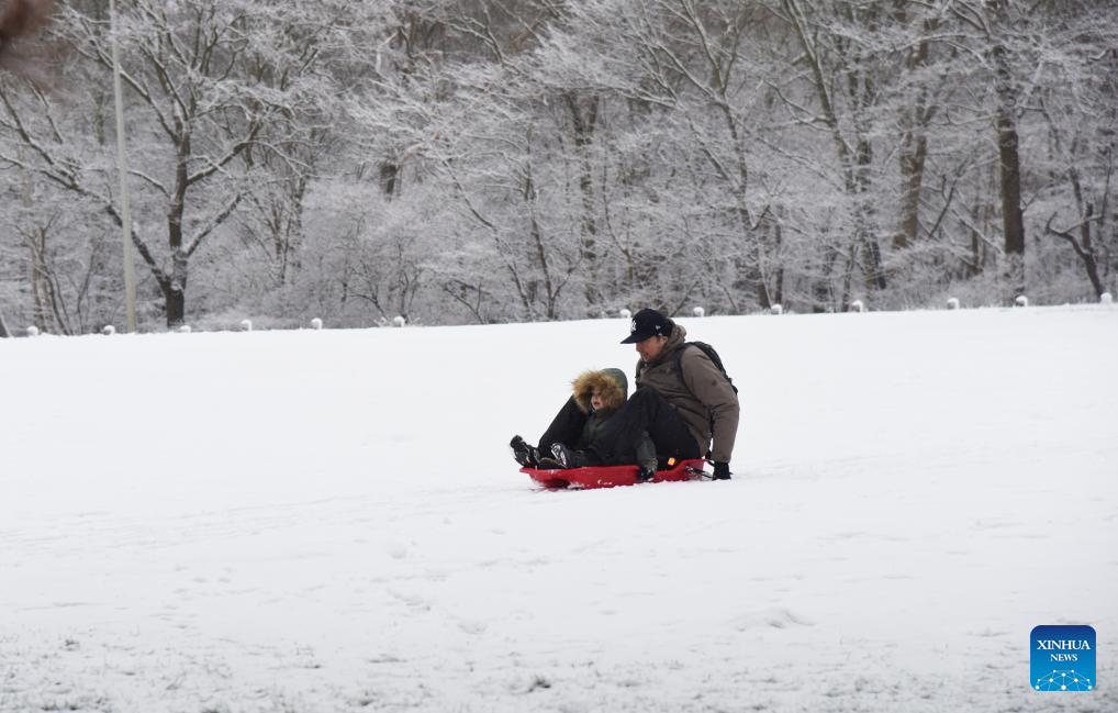 A man and a child enjoy sledding in the snow in the Hague, the Netherlands, Jan. 7, 2026. The Royal Netherlands Meteorological Institute (KNMI) issued a code orange snowfall warning on Wednesday, with some areas of the Netherlands receiving up to 10 centimeters of snow. (Xinhua/Shao Haijun)