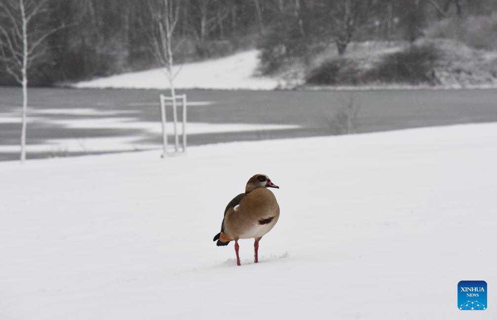 A bird stands in the snow in the Hague, the Netherlands, Jan. 7, 2026. The Royal Netherlands Meteorological Institute (KNMI) issued a code orange snowfall warning on Wednesday, with some areas of the Netherlands receiving up to 10 centimeters of snow. (Xinhua/Shao Haijun)