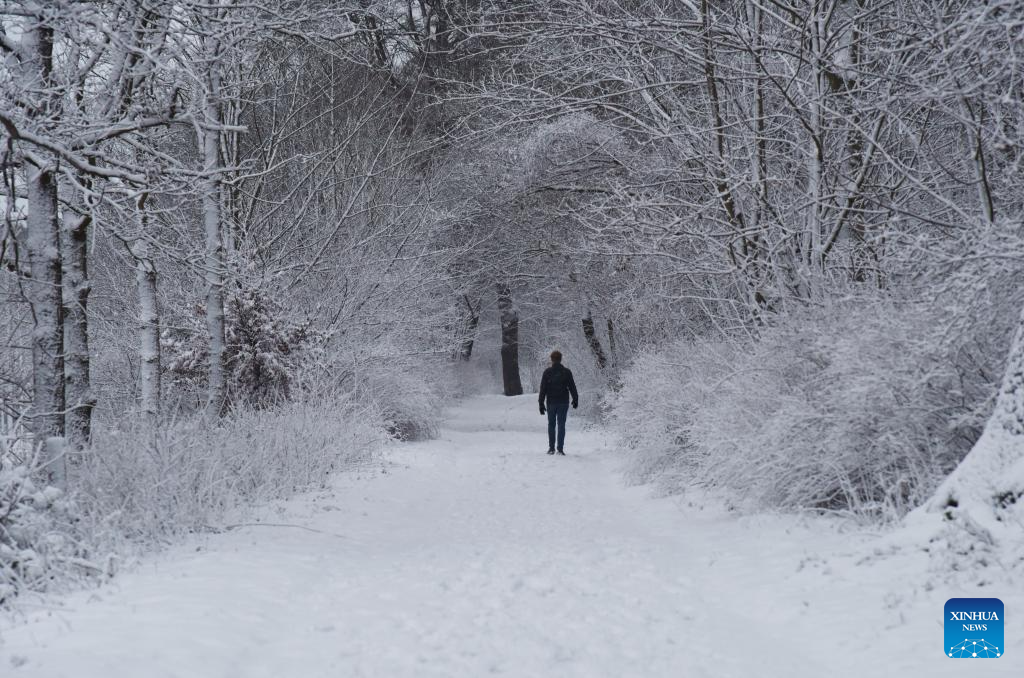 A man walks down a road covered with snow in the Hague, the Netherlands, Jan. 7, 2026. The Royal Netherlands Meteorological Institute (KNMI) issued a code orange snowfall warning on Wednesday, with some areas of the Netherlands receiving up to 10 centimeters of snow. (Xinhua/Shao Haijun)