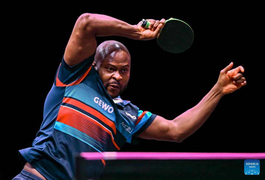 Quadri Aruna of Nigeria competes during the men's singles Round of 32 match against Liang Jingkun of China at the WTT Champions Doha 2026 in Doha, Qatar, Jan. 8, 2026. (Photo by Nikku/Xinhua)