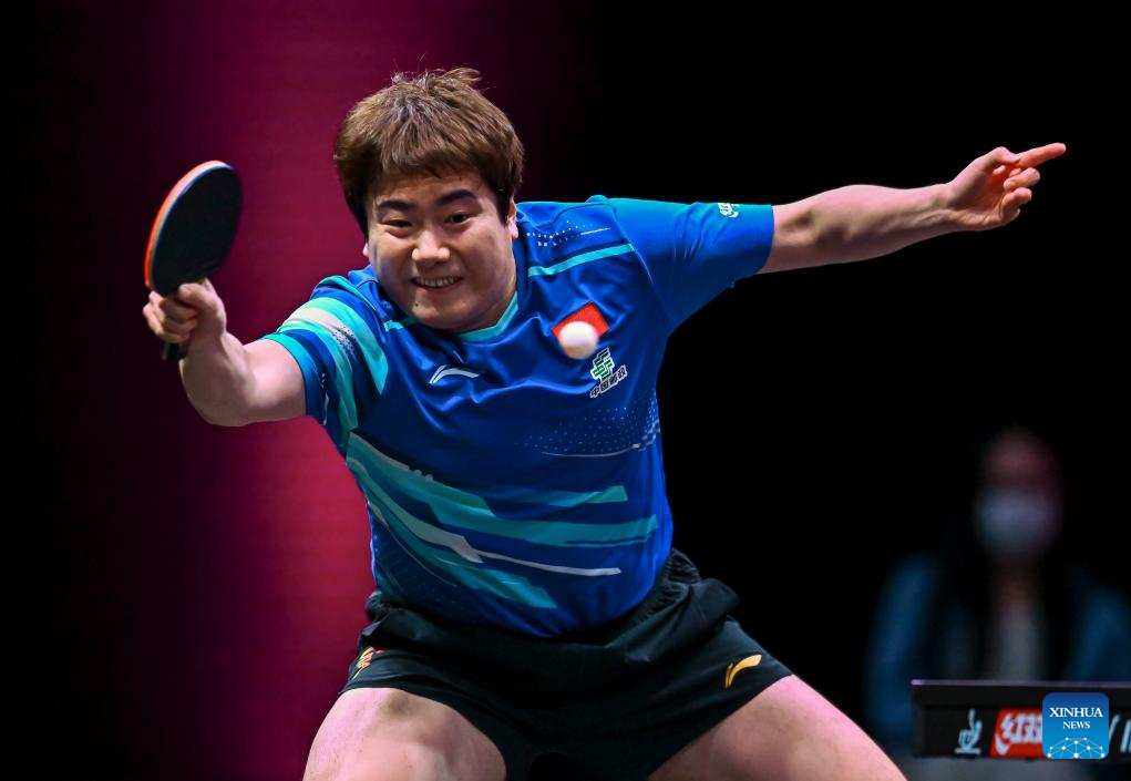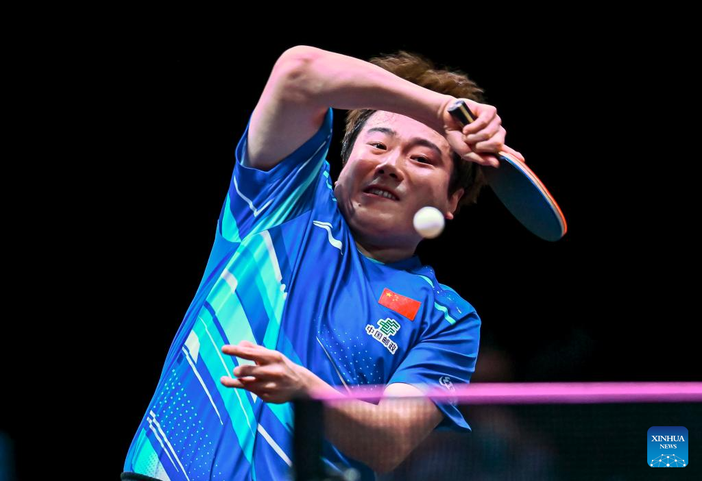 Liang Jingkun of China competes during the men's singles Round of 32 match against Quadri Aruna of Nigeria at the WTT Champions Doha 2026 in Doha, Qatar, Jan. 8, 2026. (Photo by Nikku/Xinhua)