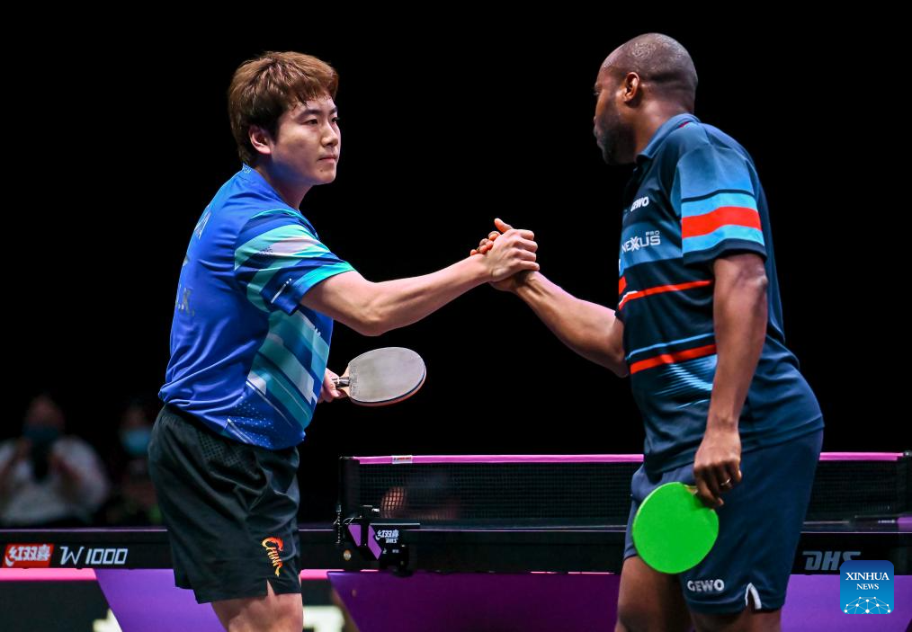 Liang Jingkun of China shakes hands with Quadri Aruna of Nigeria after their men's singles Round of 32 match at the WTT Champions Doha 2026 in Doha, Qatar, Jan. 8, 2026. (Photo by Nikku/Xinhua)