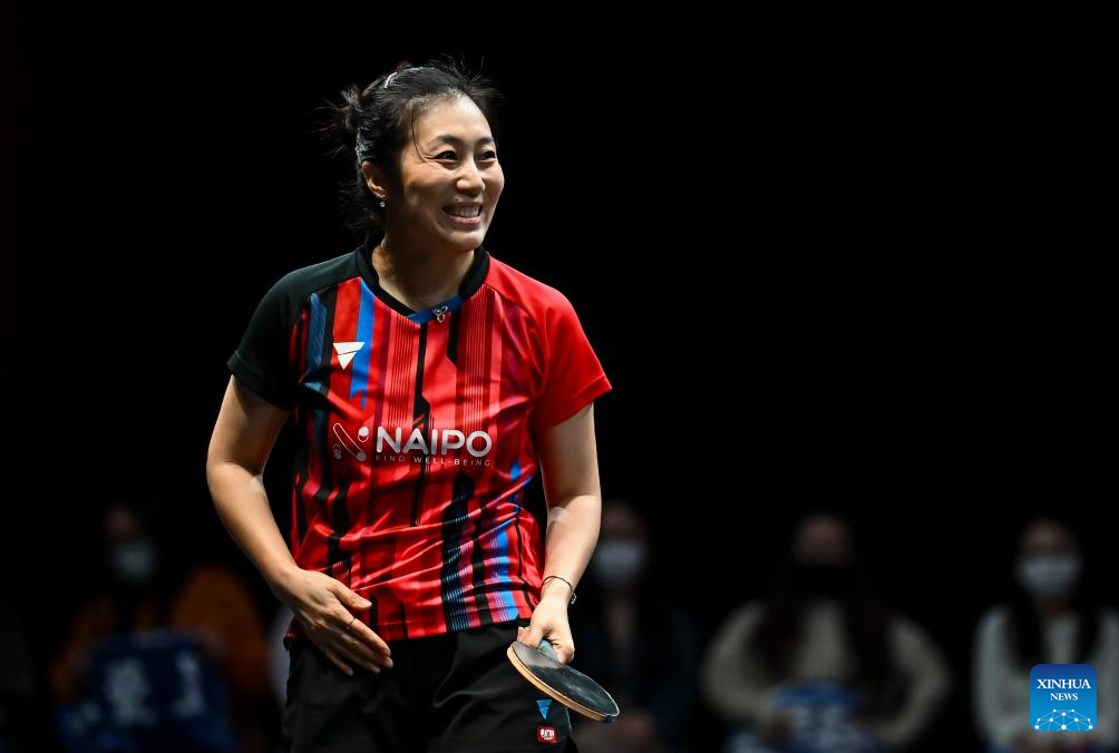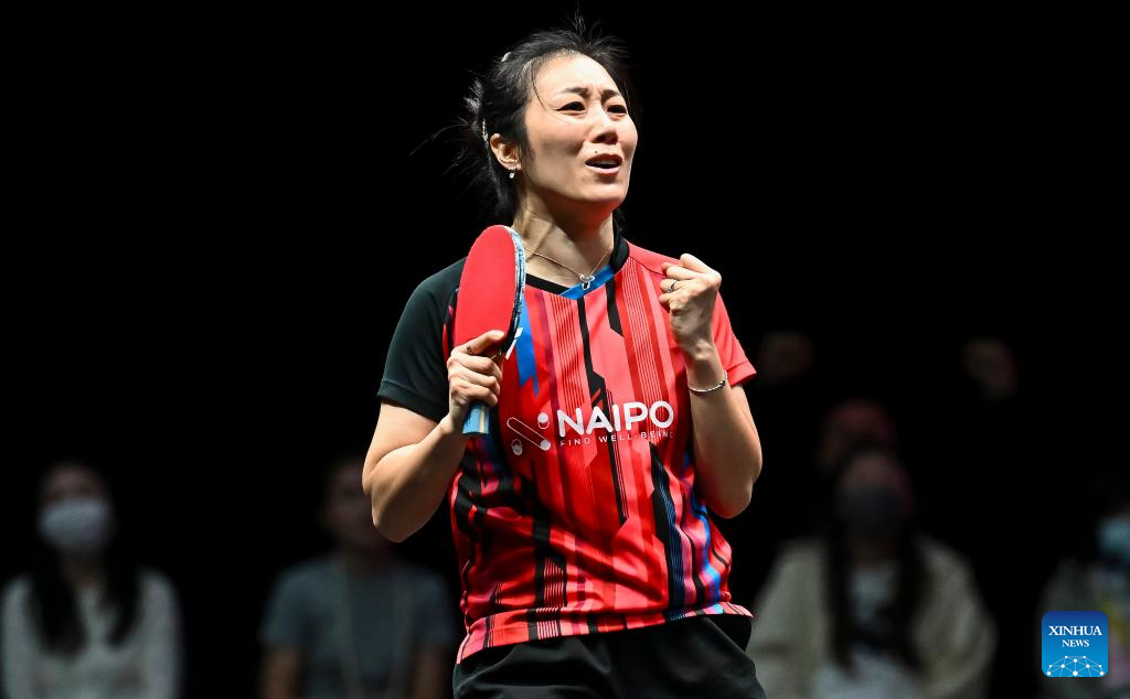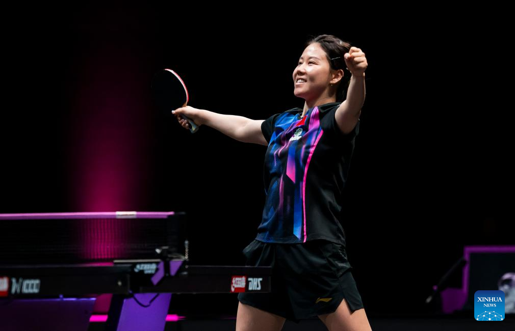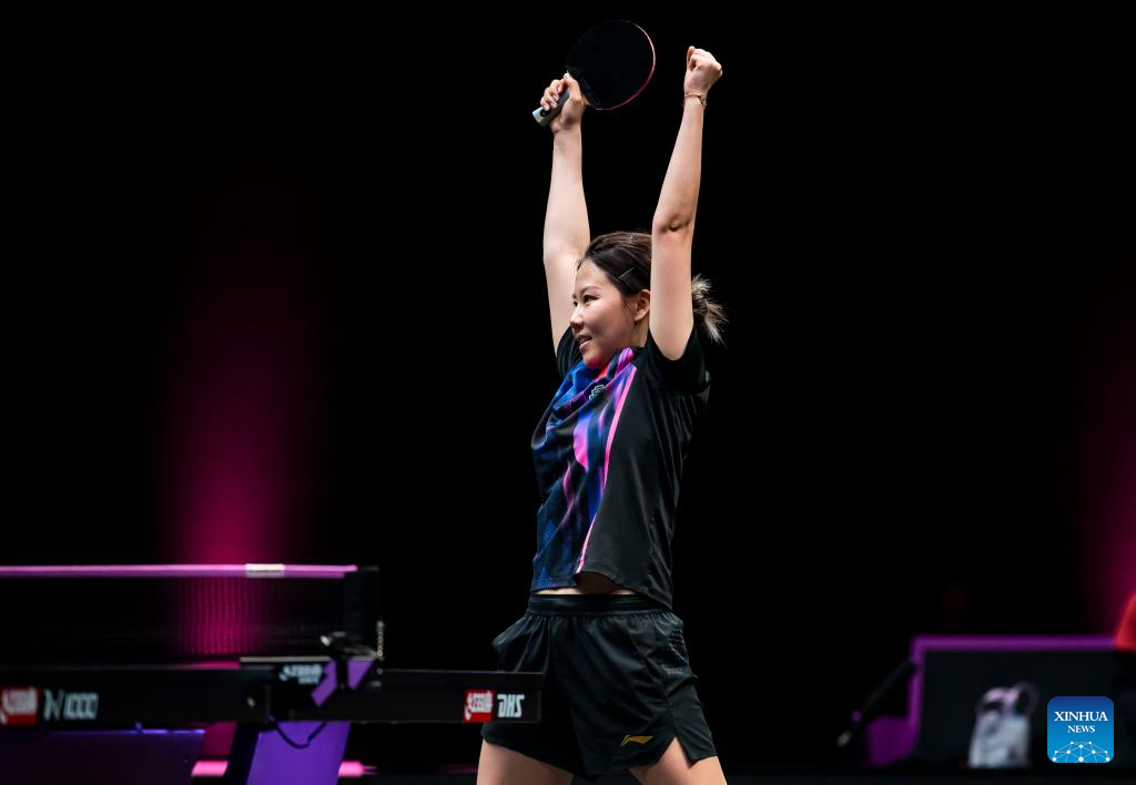 Han Ying of Germany celebrates after the women's singles quarter-final match against Wang Manyu of China at the WTT Champions Doha 2026 in Doha, Qatar, on Jan. 10, 2026. (Photo by Nikku/Xinhua)