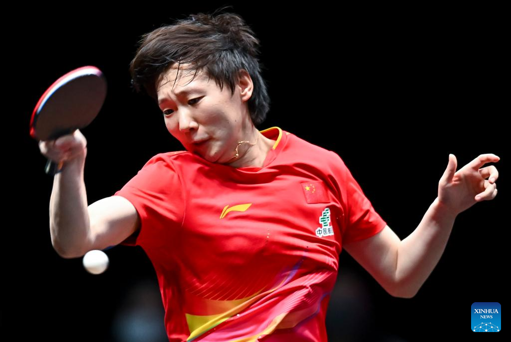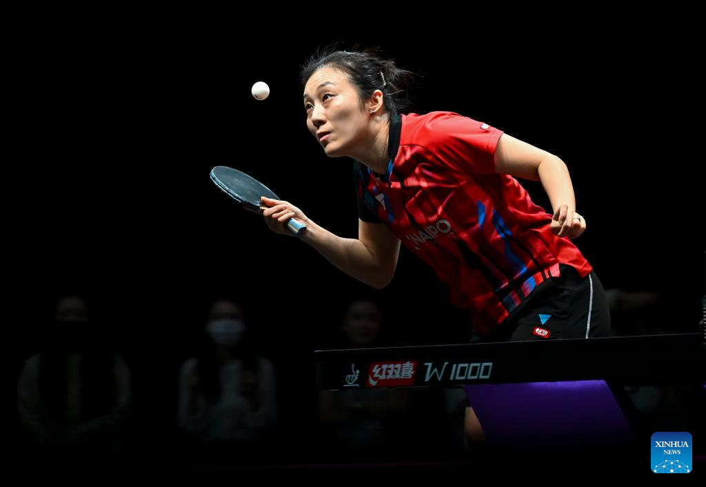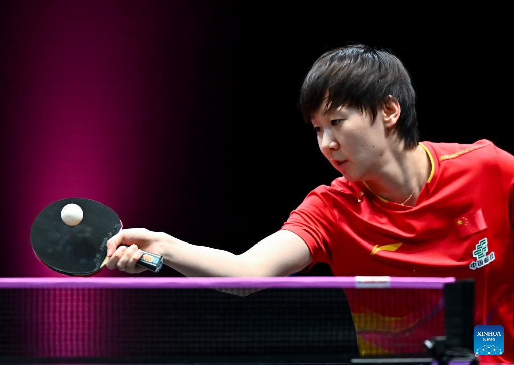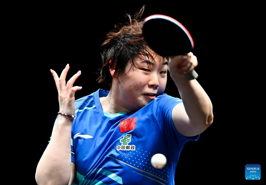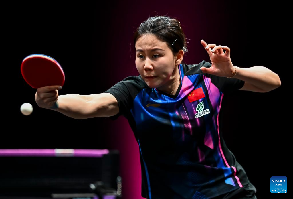 Wang Manyu of China hits a return during the women's singles quarter-final match against Han Ying of Germany at the WTT Champions Doha 2026 in Doha, Qatar, on Jan. 10, 2026. (Photo by Nikku/Xinhua)