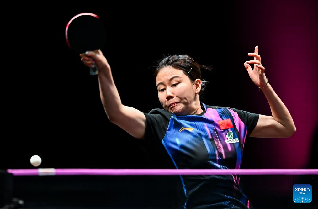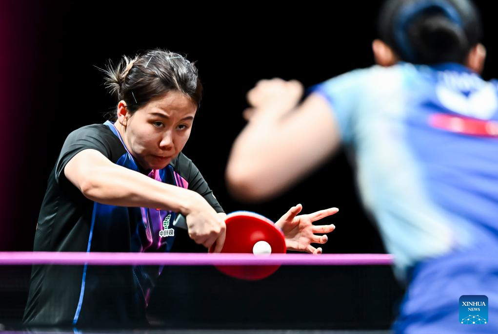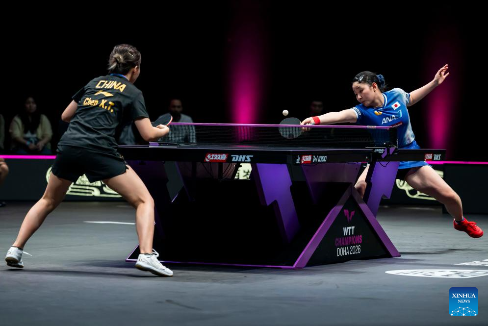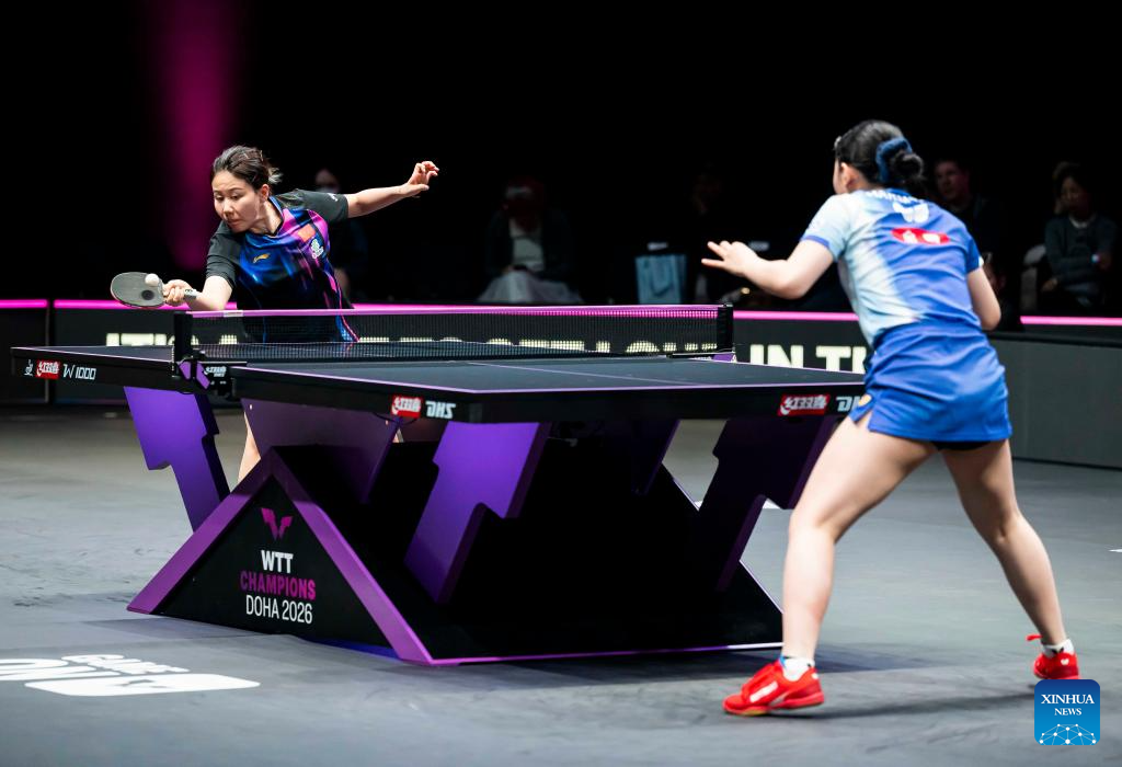 Kuai Man of China hits a return during the women's singles quarter-final match against Nagasaki Miyu of Japan at the WTT Champions Doha 2026 in Doha, Qatar, on Jan. 10, 2026. (Photo by Nikku/Xinhua)