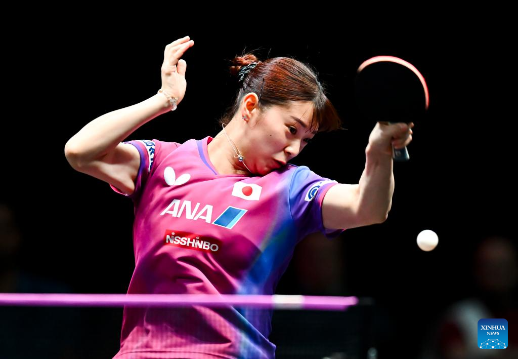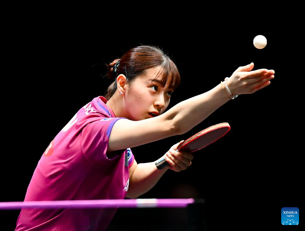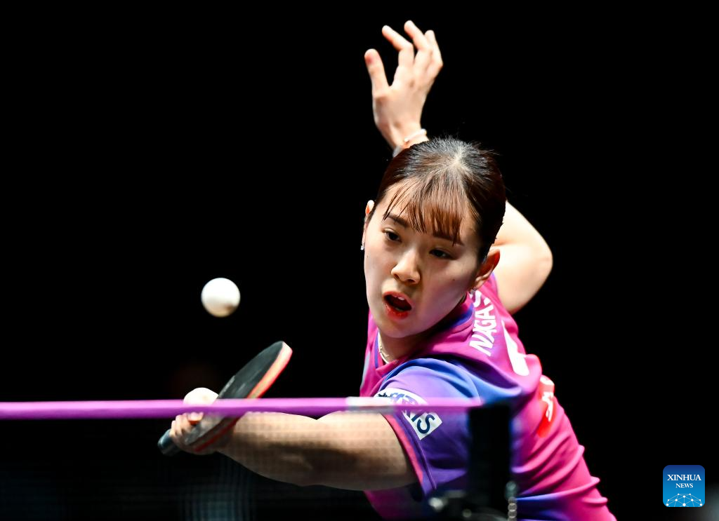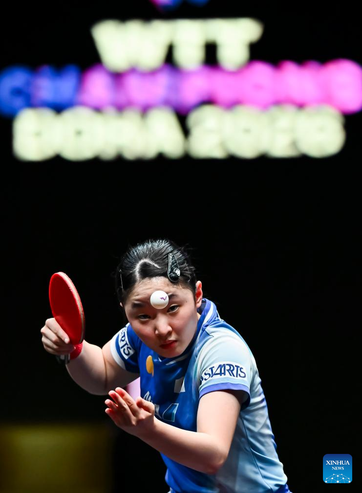 Nagasaki Miyu of Japan hits a return during the women's singles quarter-final match against Kuai Man of China at the WTT Champions Doha 2026 in Doha, Qatar, on Jan. 10, 2026. (Photo by Nikku/Xinhua)