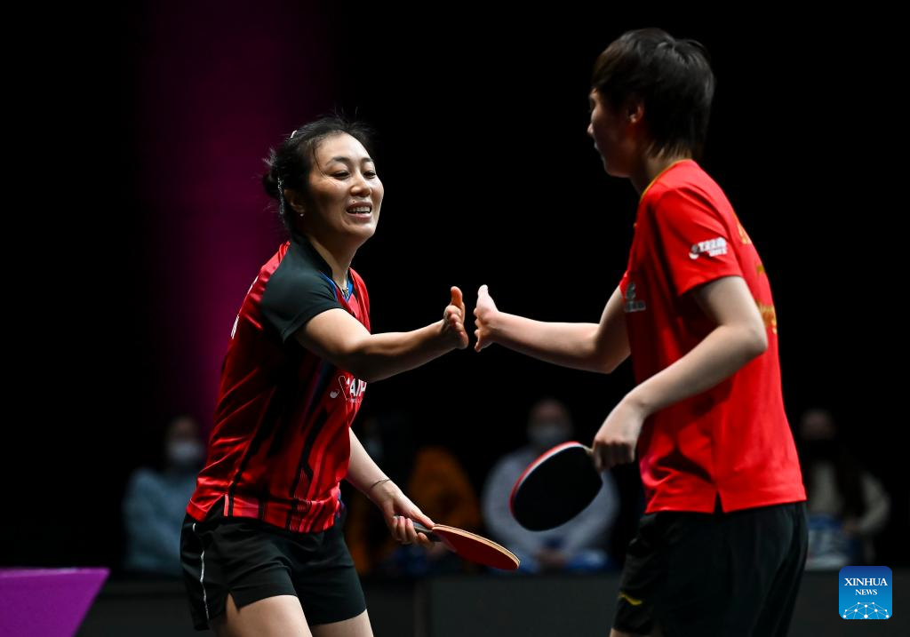 Han Ying (L) of Germany claps hands with Wang Manyu of China after their women's singles quarter-final match at the WTT Champions Doha 2026 in Doha, Qatar, on Jan. 10, 2026. (Photo by Nikku/Xinhua)