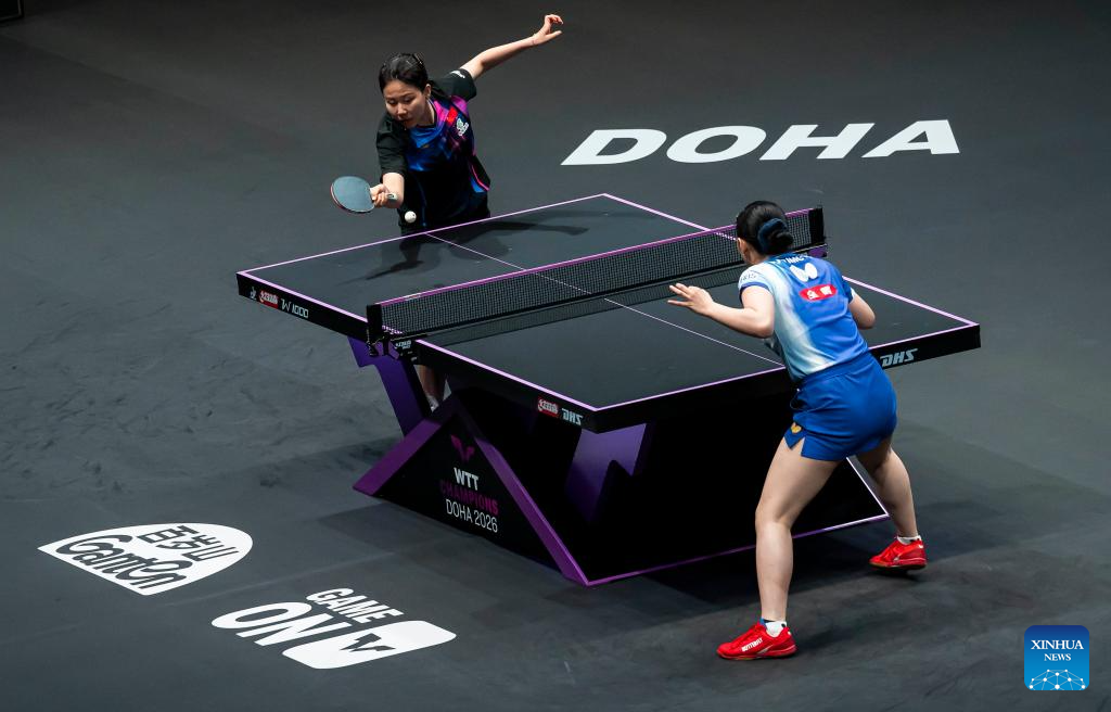 Chen Xingtong (L) of China hits a return during the women's singles quarter-final match against Harimoto Miwa of Japan at the WTT Champions Doha 2026 in Doha, Qatar, on Jan. 10, 2026. (Photo by Nikku/Xinhua)