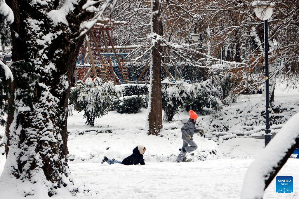 Children run amid snowfall at a park in Bucharest, Romania, on Jan. 11, 2026.