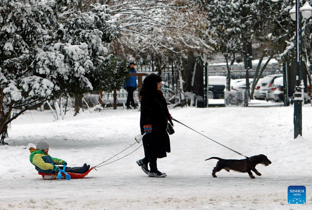 A woman walks with her dog and pulls a sledge carrying her child amid snowfall at a park in Bucharest, Romania, on Jan. 11, 2026.