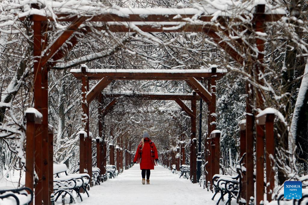 A woman walks amid snowfall at a park in Bucharest, Romania, on Jan. 11, 2026.