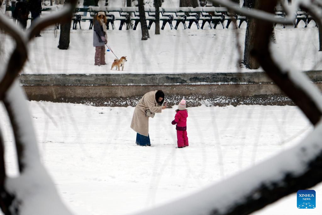People walk amid snowfall at a park in Bucharest, Romania, on Jan. 11, 2026.