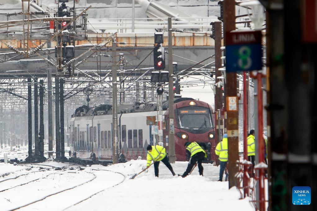 Workers clear snow amid snowfall at North Railway station in Bucharest, Romania, on Jan. 11, 2026.