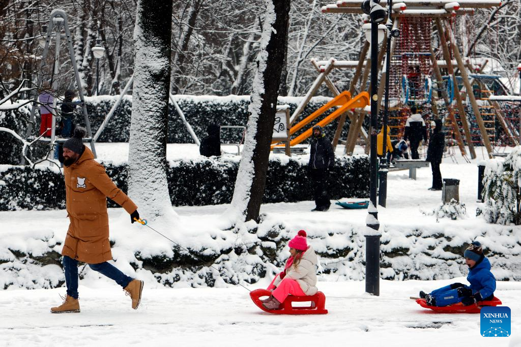 A man pulls two sledges carrying his children amid snowfall at a park in Bucharest, Romania, on Jan. 11, 2026.