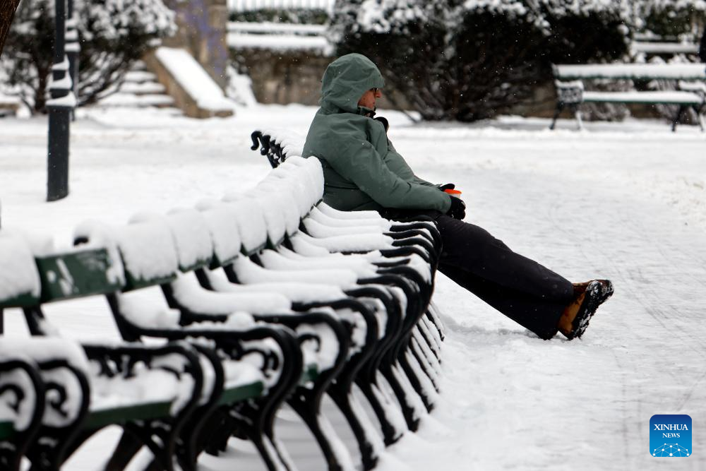A man rests on a bench amid snowfall at a park in Bucharest, Romania, on Jan. 11, 2026.