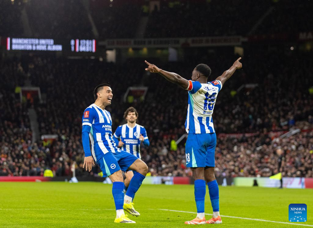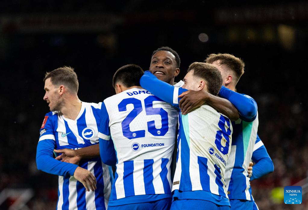 Brighton & Hove Albion's Danny Welbeck (C) celebrates his goal with his teammates during the FA Cup 3rd Round match between Manchester United FC and Brighton & Hove Albion FC in Manchester, Britain, on Jan. 11, 2026. (Xinhua)
