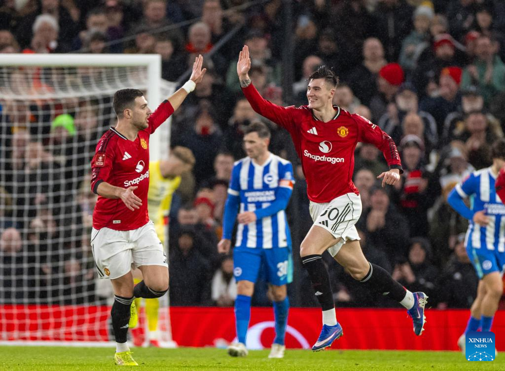 Manchester United's Benjamin Sesko (R) celebrates after scoring during the FA Cup 3rd Round match between Manchester United FC and Brighton & Hove Albion FC in Manchester, Britain, on Jan. 11, 2026. (Xinhua)