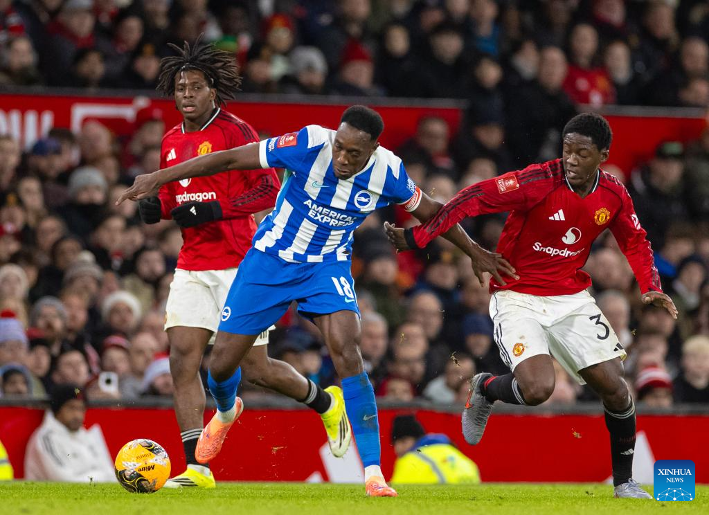 Manchester United's Manuel Ugarte (L) vies with Brighton & Hove Albion's Brajan Gruda (C) during the FA Cup 3rd Round match between Manchester United FC and Brighton & Hove Albion FC in Manchester, Britain, on Jan. 11, 2026. (Xinhua)