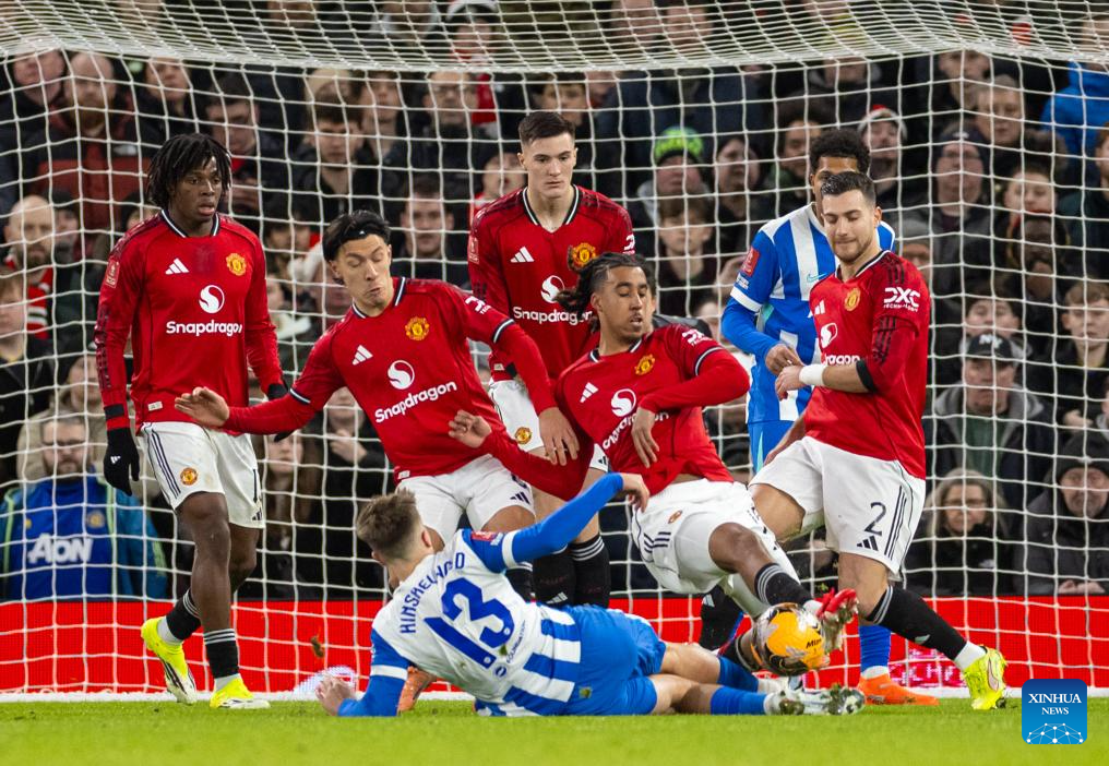 Five Manchester United's players challenge Brighton & Hove Albion's Jack Hinshelwood (bottom) during the FA Cup 3rd Round match between Manchester United FC and Brighton & Hove Albion FC in Manchester, Britain, on Jan. 11, 2026. (Xinhua)