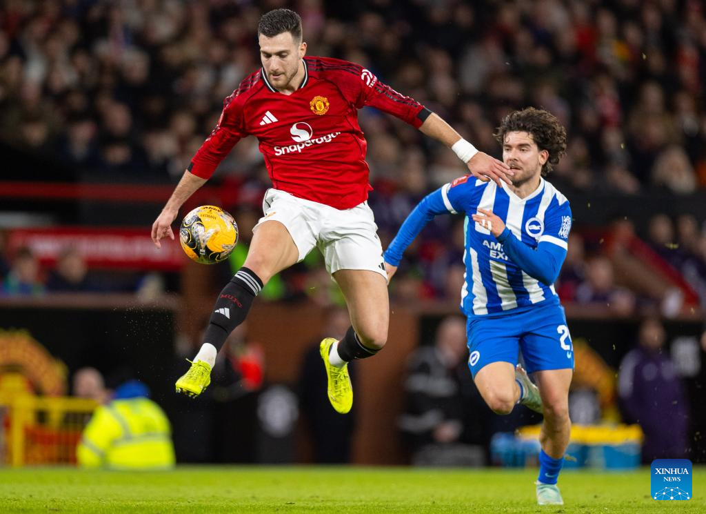 Manchester United's Diogo Dalot (L) controls the ball during the FA Cup 3rd Round match between Manchester United FC and Brighton & Hove Albion FC in Manchester, Britain, on Jan. 11, 2026. (Xinhua)