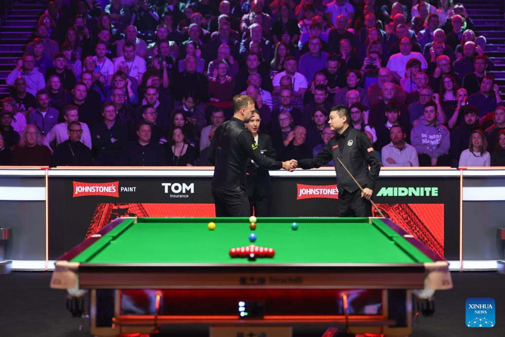 Ding Junhui (front R) of China greets Judd Trump of England before their round 1 match at the 2026 Snooker Masters in London, Britain, Jan. 14, 2026. (Photo by Zhai Zheng/Xinhua)