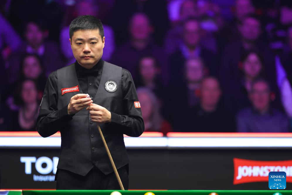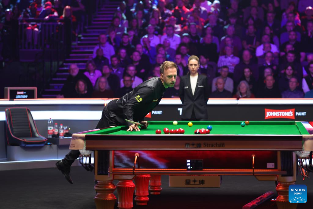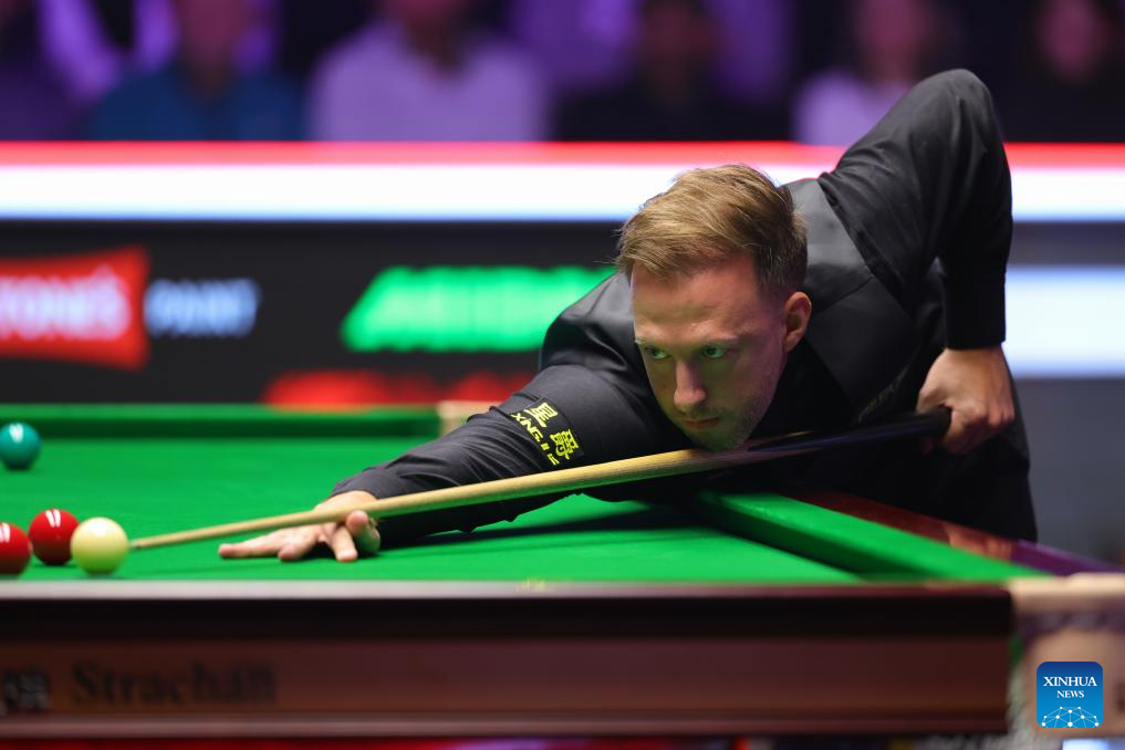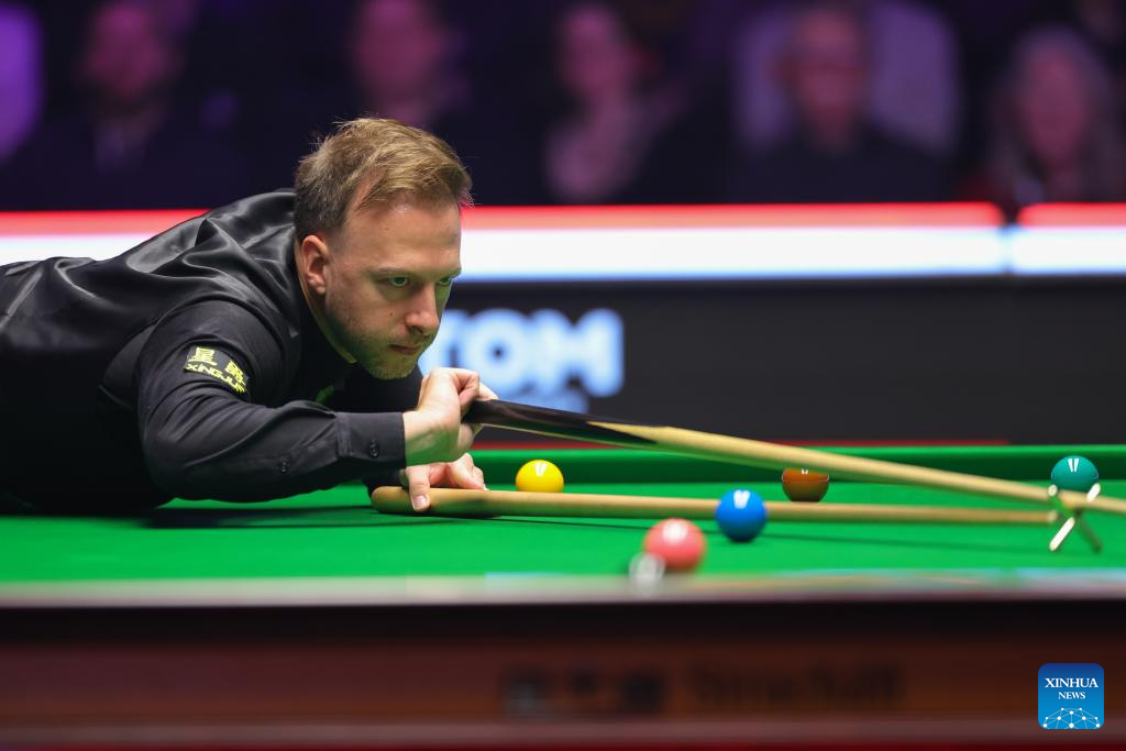 Judd Trump of England competes during the round 1 match against Ding Junhui of China at the 2026 Snooker Masters in London, Britain, Jan. 14, 2026. (Photo by Zhai Zheng/Xinhua)