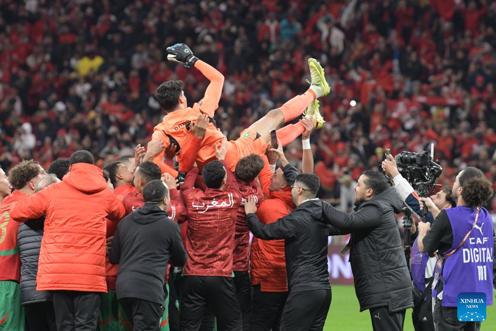 Players of Morocco celebrate victory after the Africa Cup of Nations semifinal match between Morocco and Nigeria in Rabat, Morocco, Jan. 14, 2026. (Photo by Aissa/Xinhua)