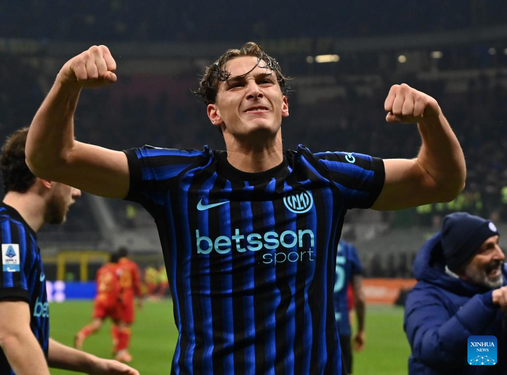 Inter Milan's Pio Esposito celebrates his goal during a Serie A football match between Inter Milan and Lecce in Milan, Italy, Jan. 14, 2026. (Photo by Alberto Lingria/Xinhua)