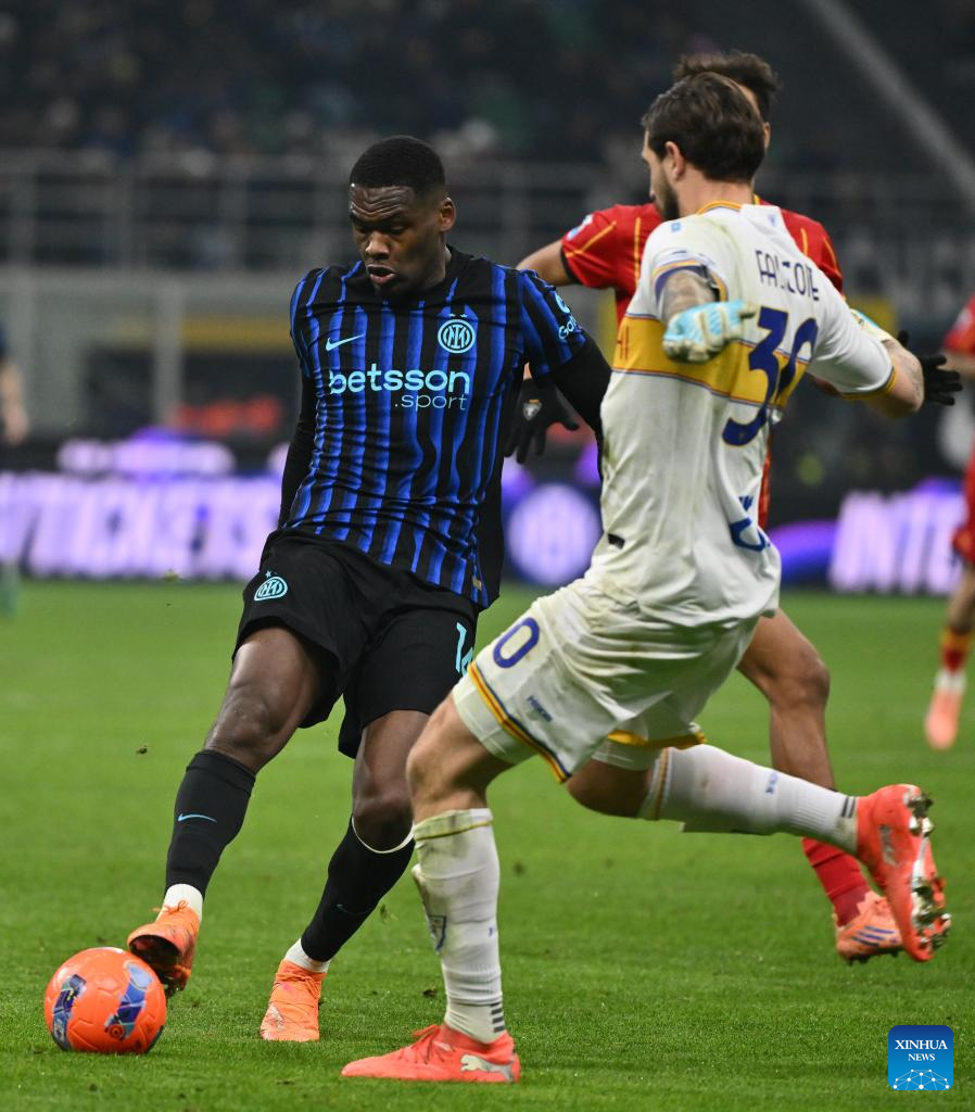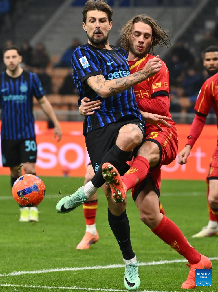 Inter Milan's Francesco Acerbi (L) vies with Lecce's Antonino Gallo during a Serie A football match between Inter Milan and Lecce in Milan, Italy, Jan. 14, 2026. (Photo by Alberto Lingria/Xinhua)