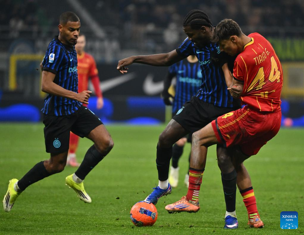 Inter Milan's Marcus Thuram (C) vies with Lecce's Tiago Gabriel (R) during a Serie A football match between Inter Milan and Lecce in Milan, Italy, Jan. 14, 2026. (Photo by Alberto Lingria/Xinhua)