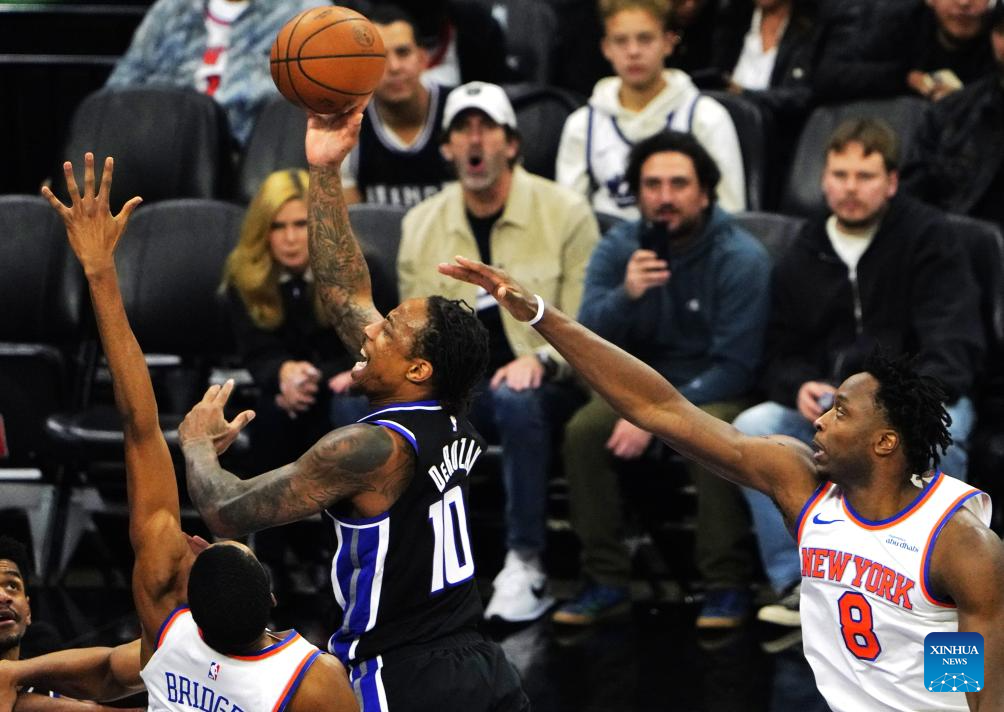 DeMar DeRozan (C) of Sacramento Kings goes for a layup during the 2025-2026 NBA regular season basketball game between Sacramento Kings and New York Knicks in Sacramento, the United States, Jan. 14, 2026. (Xinhua/Wu Xiaoling)